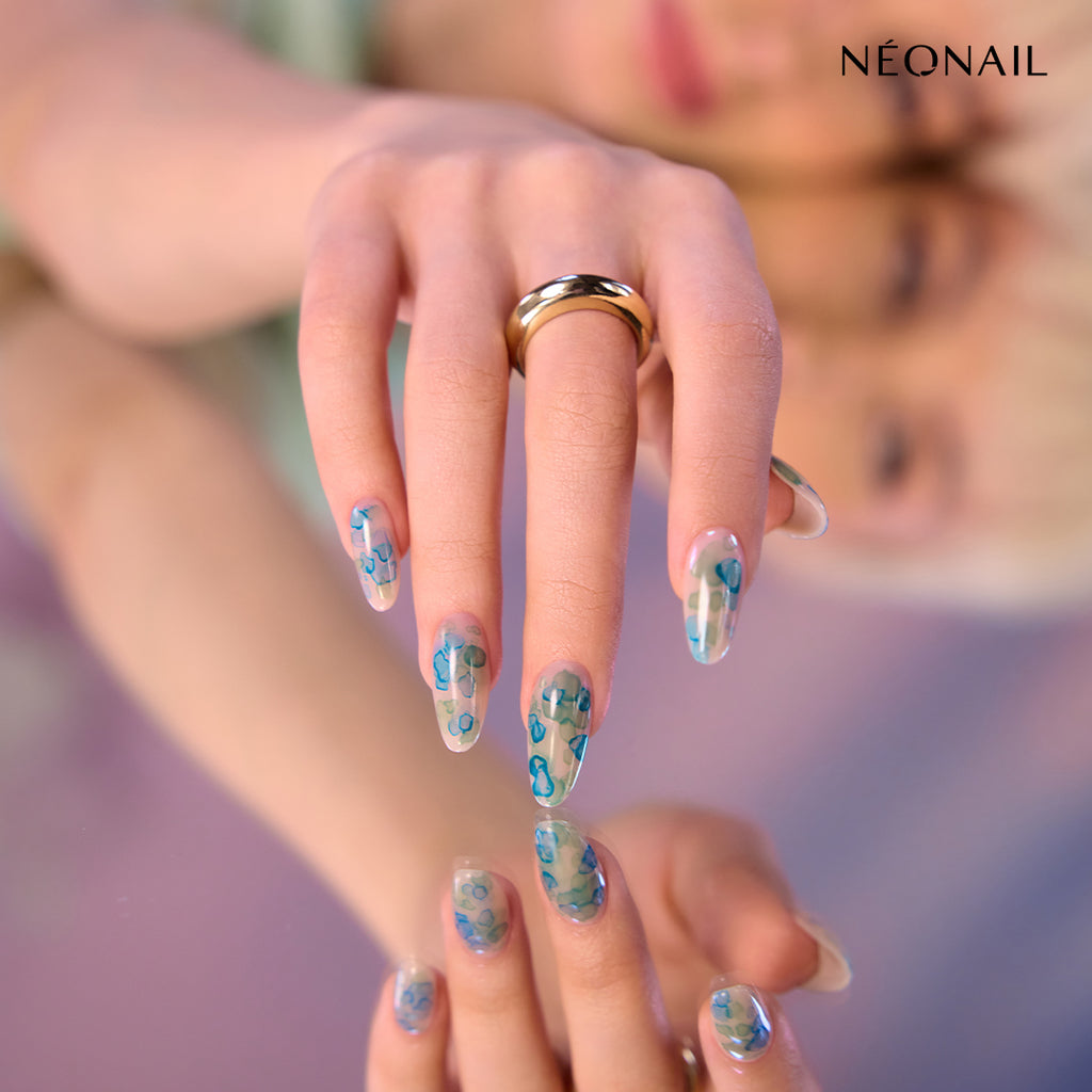 The ink creates a blur effect, resembling the flow of watercolor on the nail plate. This futuristic accent will become the main nail fashion trend of spring 2025! It is sure to surprise you, as the ink color changes depending on the shade of the UV gel base. Discover a new way to make your manicure even more exciting!