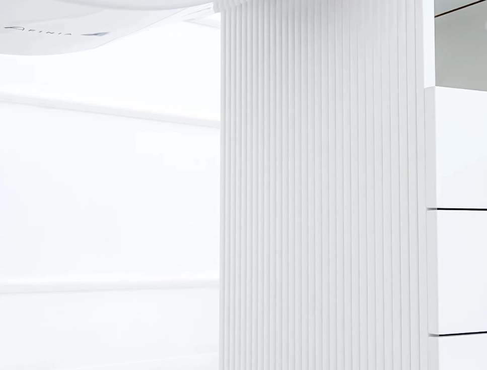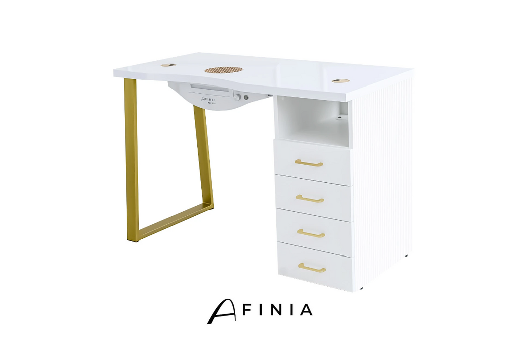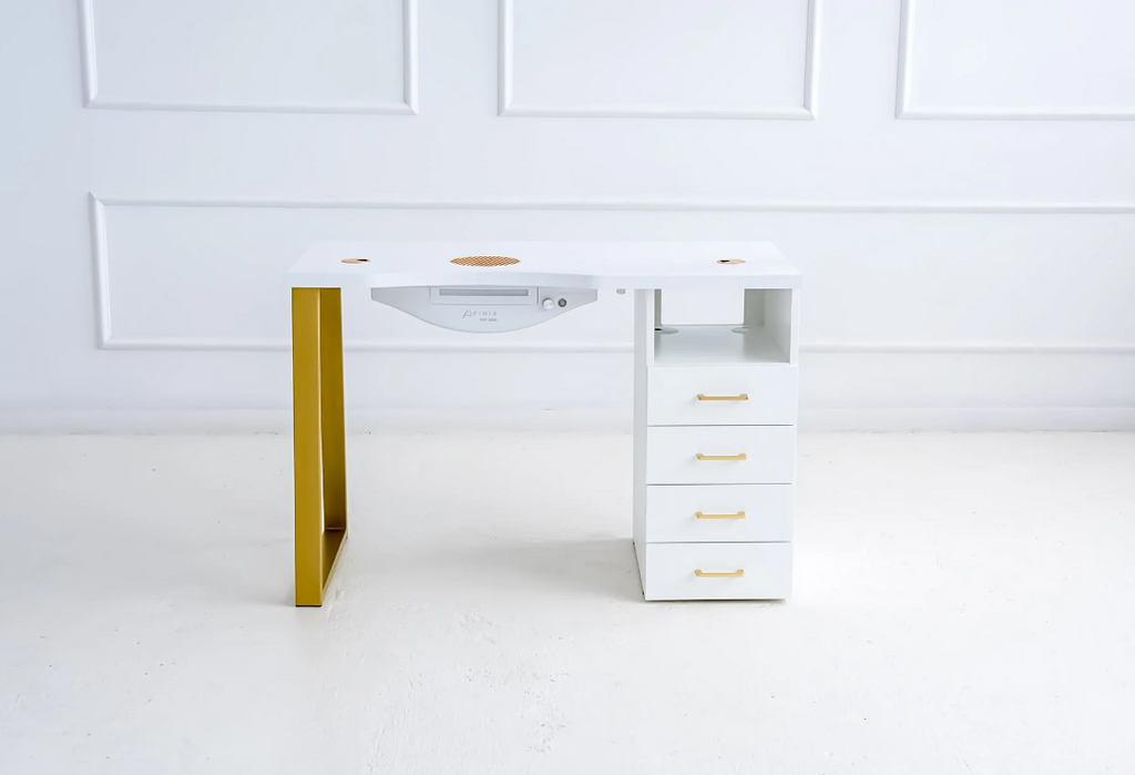 The Afinia Prime Gold nail table is a refined blend of elegance and functionality, created for the most demanding beauty salons. This model stands out with its modern design, featuring golden structural elements and ribbed cabinet walls, giving it a distinctive and luxurious character.