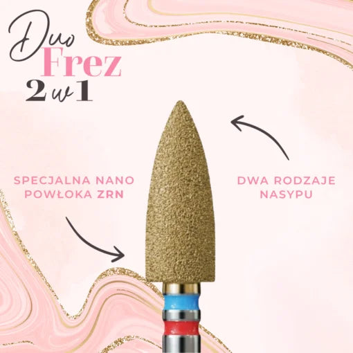 2in1 SMART GOLD LINE Bit – the standard bit size will quickly push back cuticles and remove epithelium during standard manicure procedures. The Future of Bits: Diamond bits are known for their versatility and excellent customization options. Unfortunately, diamond abrasives are less durable for everyday use compared to bits made from sintered carbide. To address the issue of frequently changing tools, we have created the DUO Drill. What is the innovation of the Duo Drill? The standard diamond sand gaps have been additionally filled with fine sand to significantly extend the tool's lifespan. Now, you don't have to worry about your bits needing frequent replacement, and you can enjoy your favorite shapes for a long time.