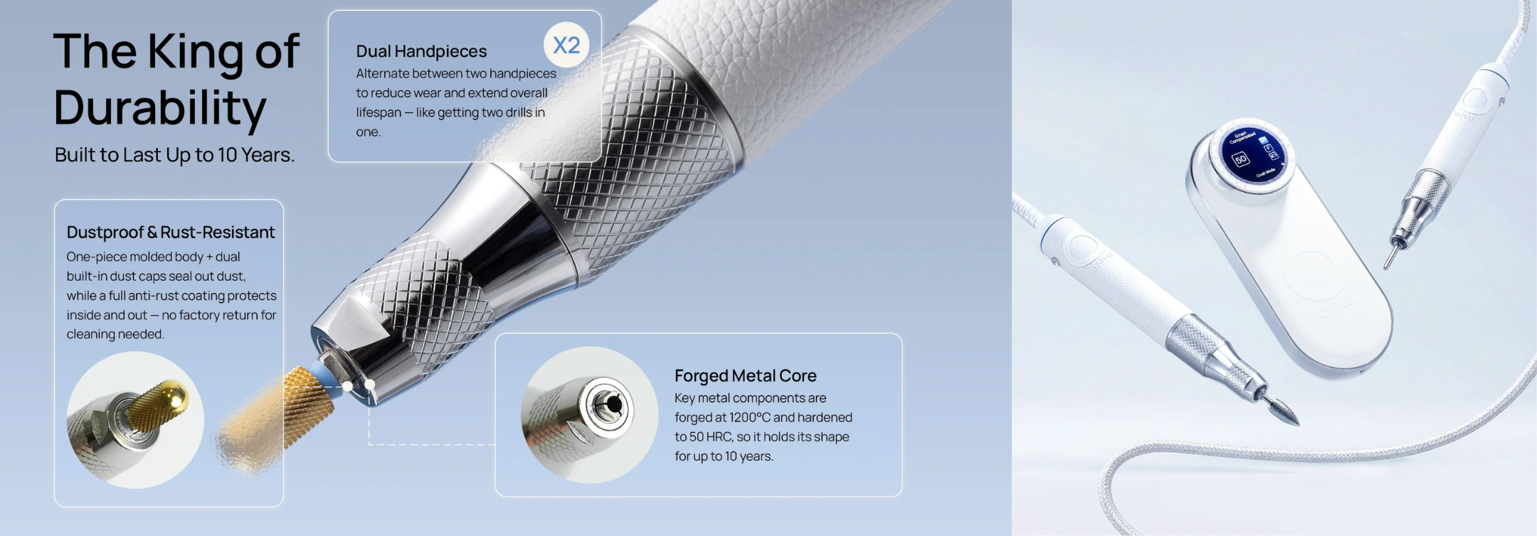 At 50,000 RPM, dust particles become ultra-fine, leaving a glass-smooth nail finish.