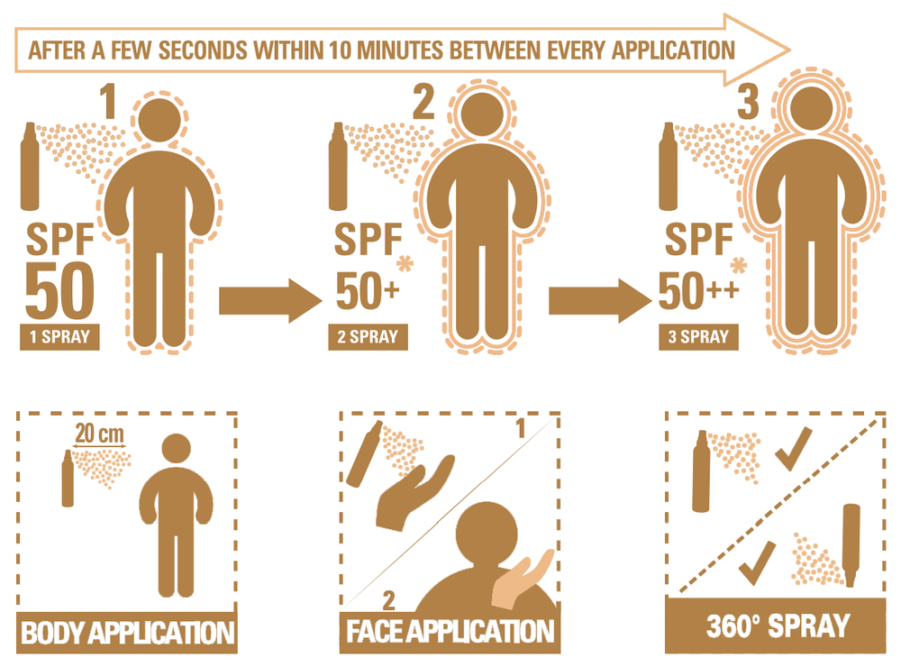 * ADDITIONAL SPF: Clinical studies have shown that the first application provides SPF 50 sun protection. A second application 10 minutes later in the same area and under the same conditions increases the SPF by 50%. A third application 10 minutes later in the same area and under the same conditions increases the SPF by 90% compared to the first application.