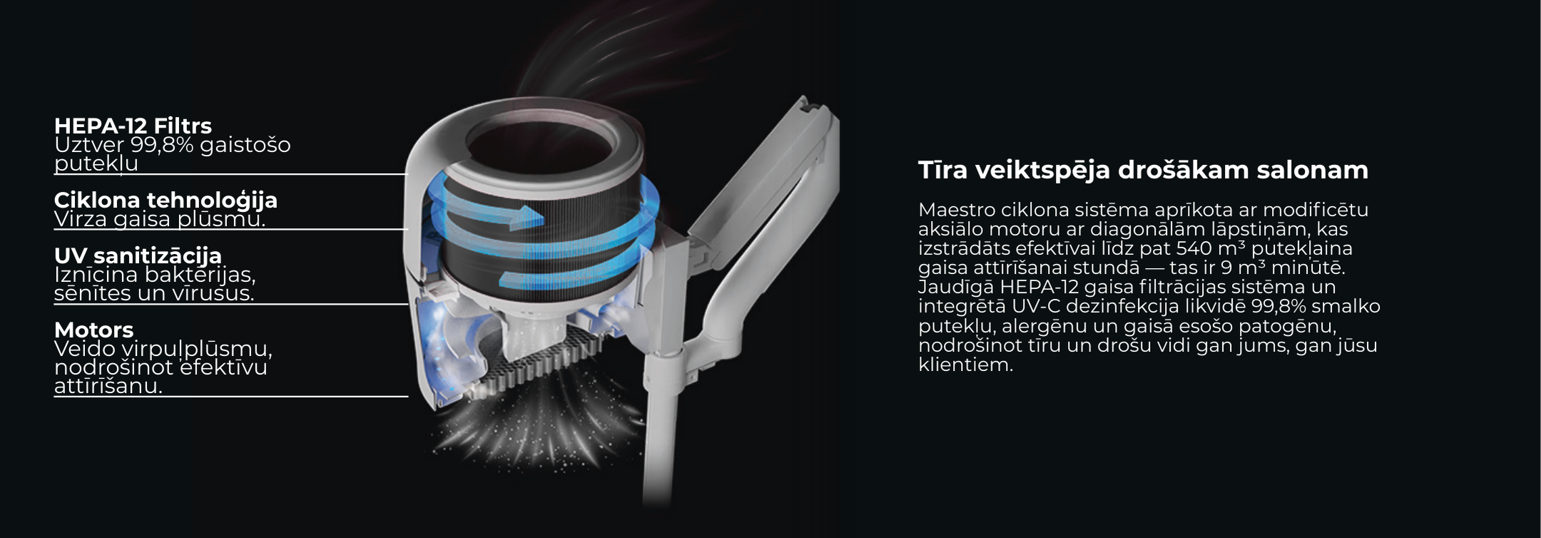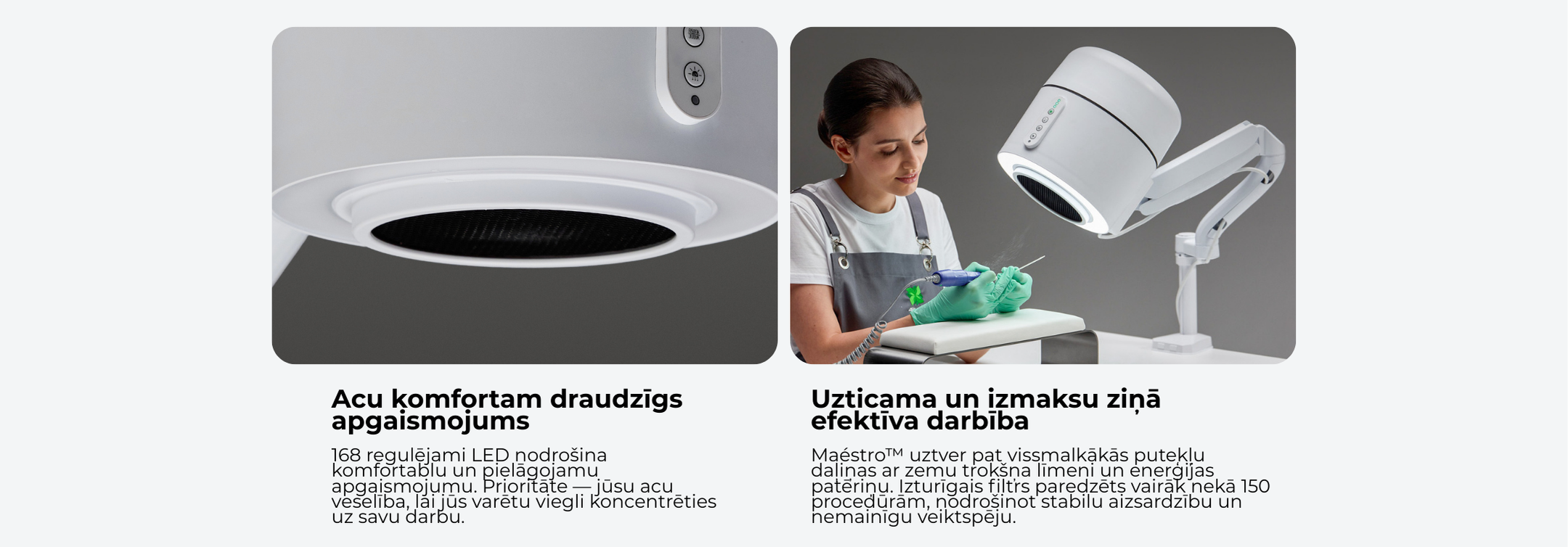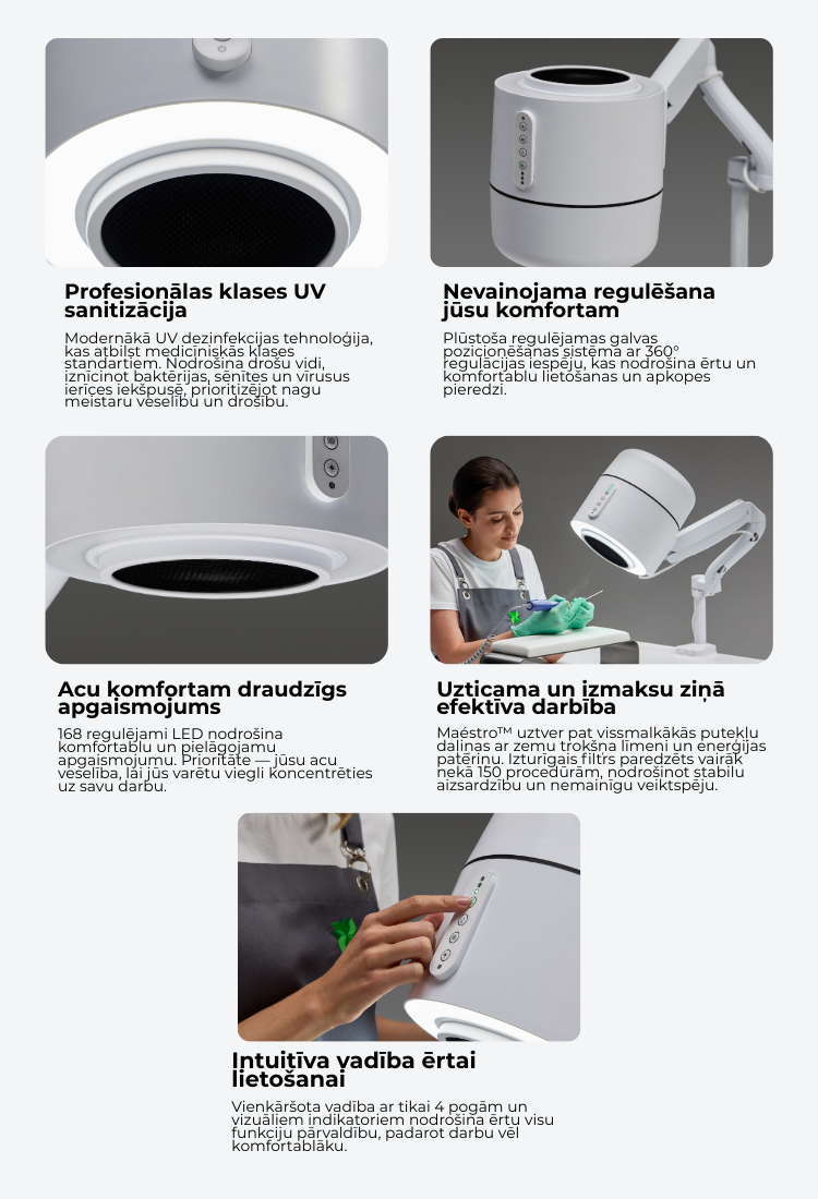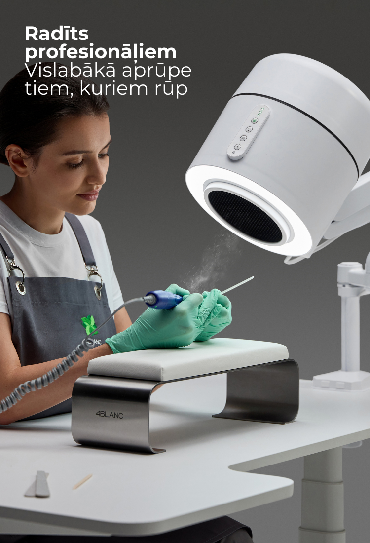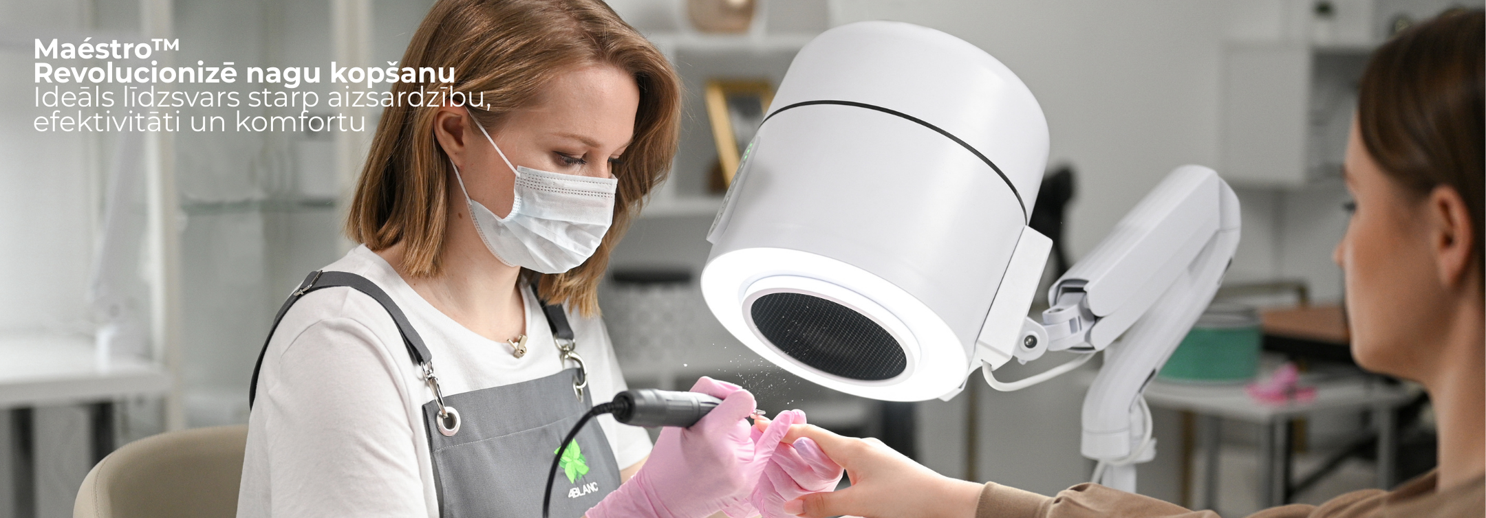 Maestro Ultimate Protection Nail Station iš 4BLANC® unikalus derinys efektyvumo ir sveikatos apsaugos meistrams bei klientams. Kompaktiškoje įrangoje įmontuotas dulkių surinkėjas, reguliuojamas apšvietimas ir UV dezinfekcija. Ilgalaikė sveikatos ir darbo aplinkos komforto išlaikymas manikiūro/pedikiūro procedūrų metu, užtikrinant saugesnę ir efektyvesnę procedūrų aplinką. Maestro siūlo neprilygstamą darbo vietos švarą ir kvėpavimo saugumą su ciklonine dulkių surinkimo sistema, HEPA12 oro filtru, kuris sulaiko 99,7% mikrodalelių, ir UV dezinfekcija, kad būtų pašalinti nuolatiniai patogenai. Lankstūs montavimo variantai ir didelė siurbimo galia apibrėžia Maestro unikalų universalumą, naudojant nagų ir pedikiūro/podologijos Smart-Disc kojų priežiūros procedūroms. Privalumai apima sumažintą profesinę sveikatos riziką (ypač: plaučių ligas, alergijų vystymąsi, akių ligas), žymiai pagerinant nagų meistrų darbo komfortą ir tuo pačiu taupant darbo vietą. Maestro sukuria mažesnį triukšmą, nesumažindamas siurbimo galios, gerina klientų komfortą ir taip didina bendrą efektyvumą, produktyvumą ir kiekvienos procedūros pasitenkinimą.