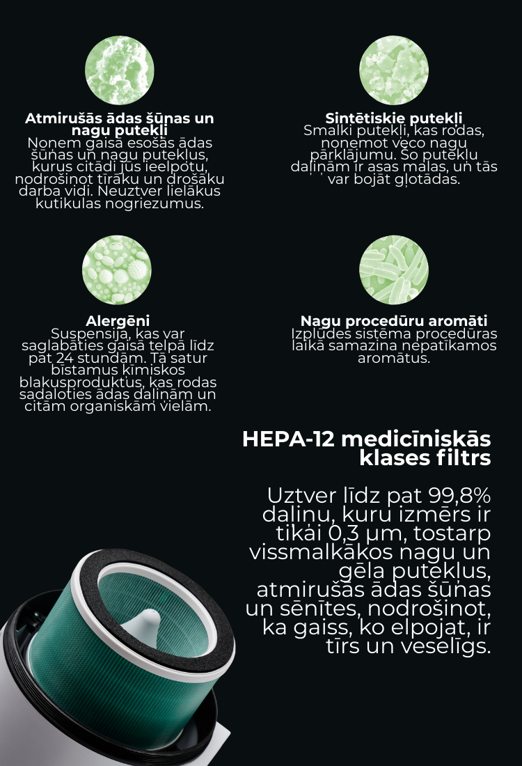 Užtikrinkite geriausią oro kokybę, reguliariai keisdami filtrą — jis sukurtas veiksmingam smulkių dulkių dalelių sulaikymui.