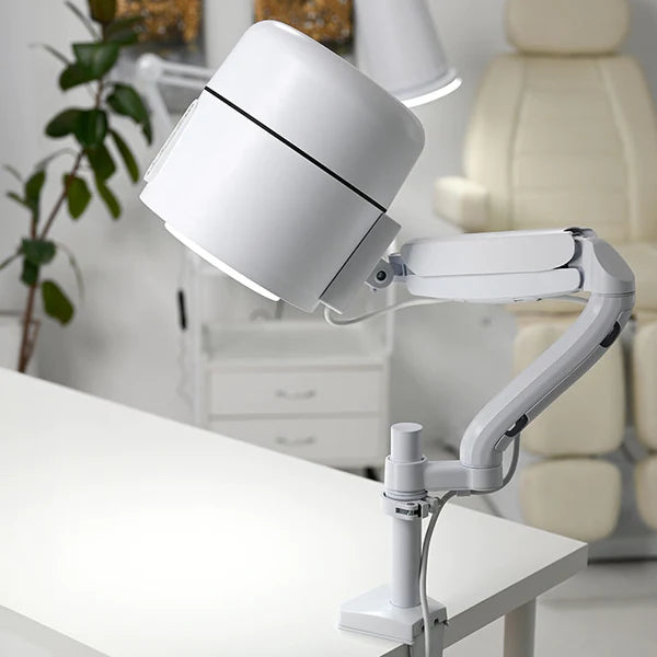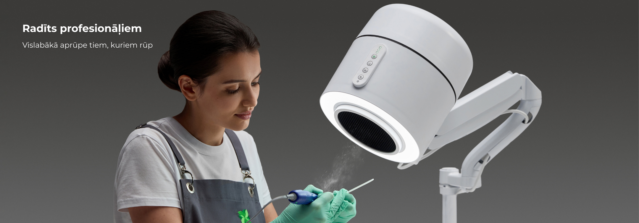 - Dizainas: cilindro formos ergonomiškas korpusas, skirtas intuityviam/paprastam valdymui; valdymo įtaisai ant korpuso (atsižvelgiant į darbą su pirštinėmis), patogus tvirtinimas ant lankstinės priešsvaros svirties patogiam kampo reguliavimui geresniam siurbimui ir apšvietimui, stalo tvirtinimo sistema reikalauja tik 10 cm² darbo vietos krašte (manikiūro stotelė), pasirinktinė tvirtinimo galimybė ant ratukų stovo perkėlimui (pedikiūro stotelė).