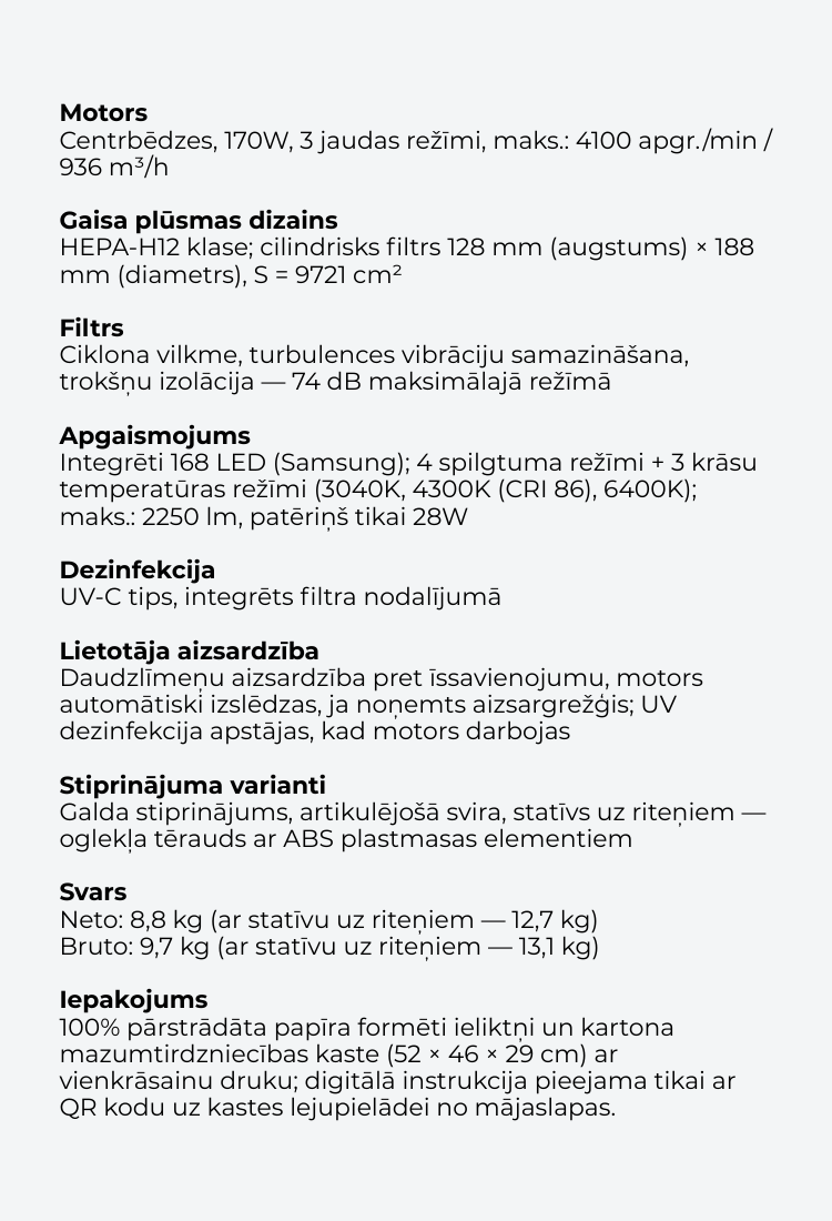 - Variklis: centrinis, 170 W, 3 galios režimai, maks.: 4100 aps./min / 936 m³/val.