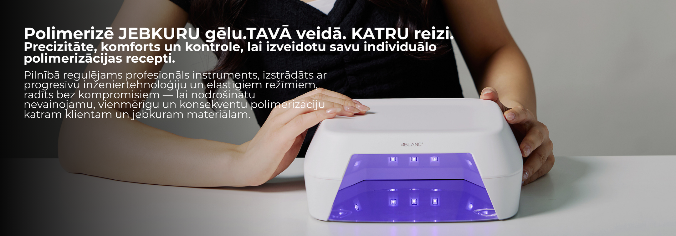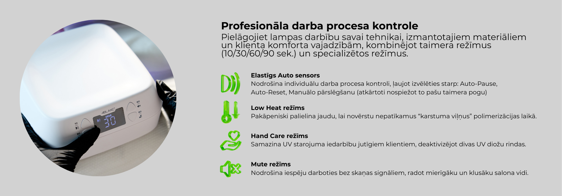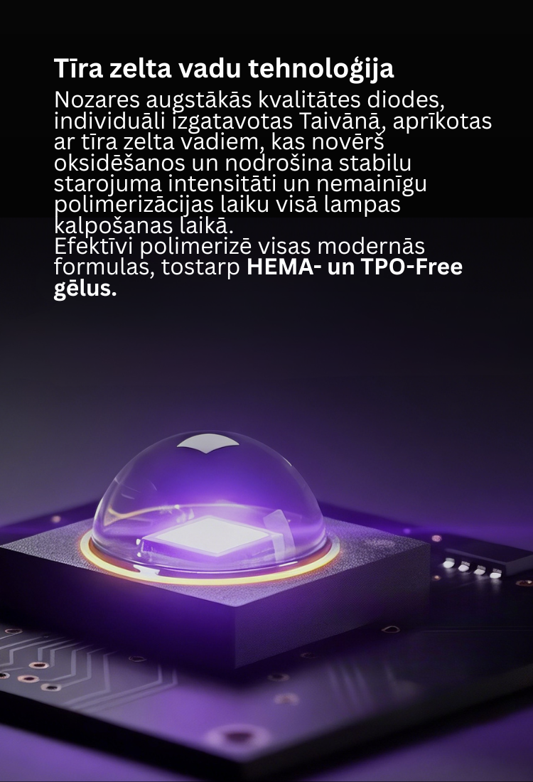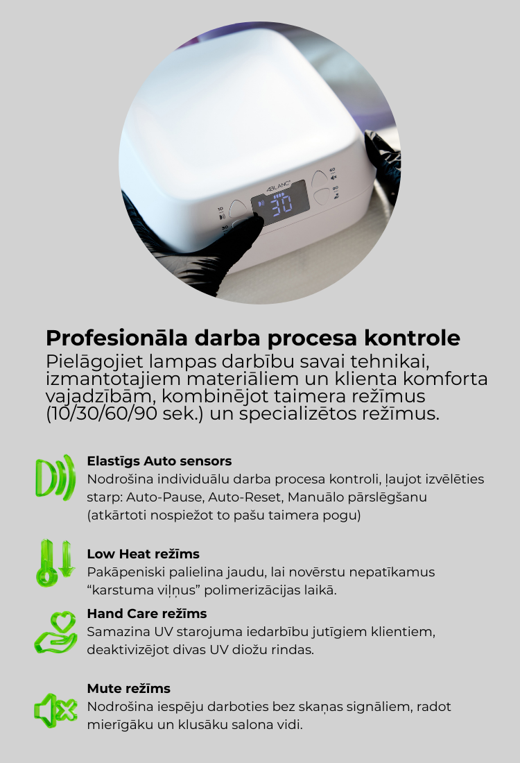 ✔ Įvairūs sukietėjimo režimai – laikmačiai 10 / 30 / 60 / 90 s, automatinis judesio jutiklio įjungimas, rankinis valdymas ir Žemos šilumos režimas jautriems nagams