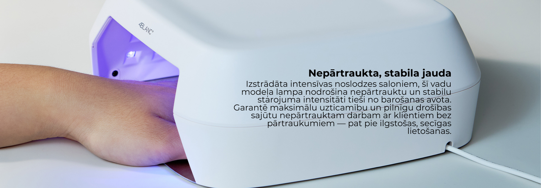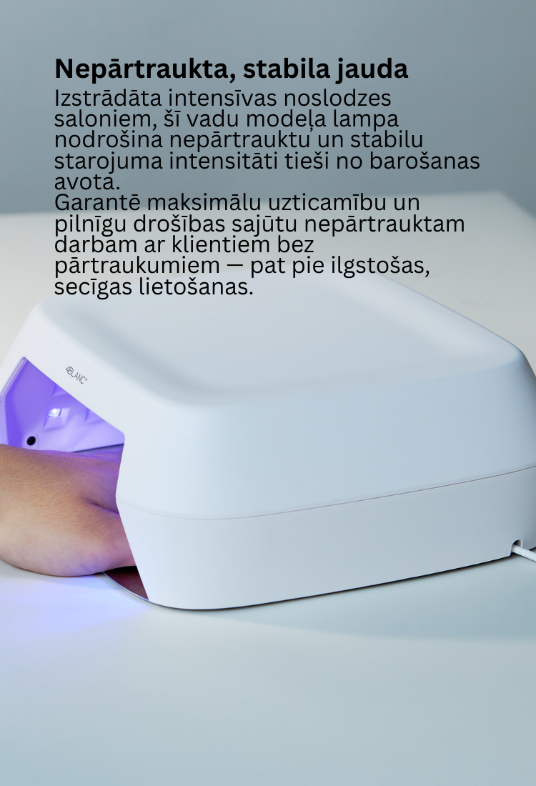 4BLANC Smart ir laidinė UV/LED nagų lempa, skirta tiek profesionaliam, tiek namų naudojimui, užtikrinanti greitą ir tolygų visų gelių produktų sukietėjimą. Lempa aprūpinta Pure Gold Wire technologija, kuri garantuoja pastovią ir nenutrūkstamą šviesos galią per visą prietaiso tarnavimo laiką.