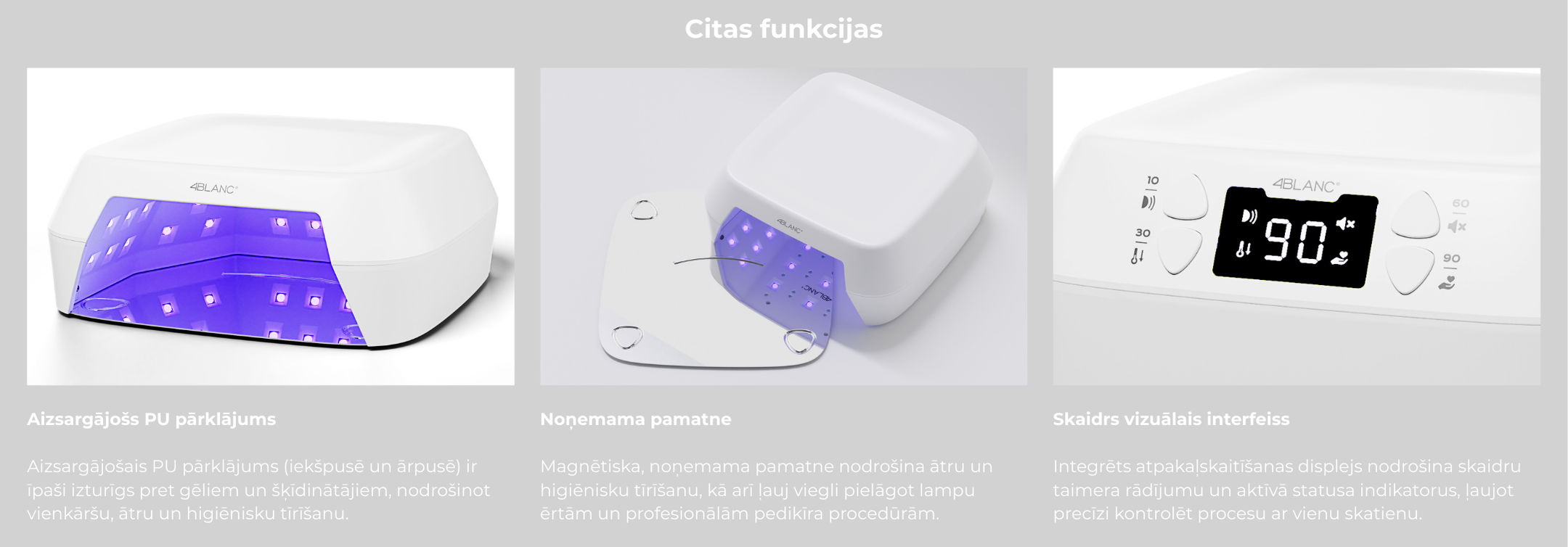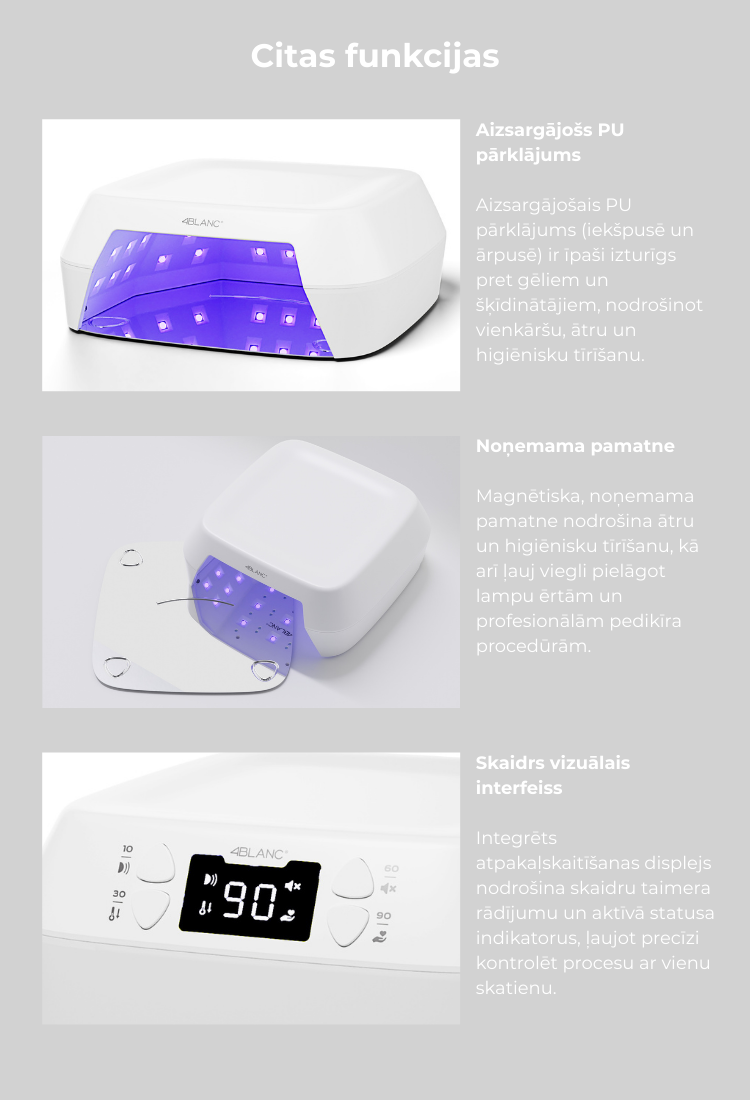 4BLANC Smart ir aukštos kokybės belaidė UV/LED nagų lempa, kuri užtikrina salono lygio rezultatus tiek namų sąlygomis, tiek profesionaliam naudojimui. Dėl Pure Gold Wire technologijos lempa suteikia pastovią ir tolygią šviesos galią per visą įrenginio tarnavimo laiką, garantuodama saugų ir nuoseklų visų gelių ir gelinių lakų polimerizavimą.