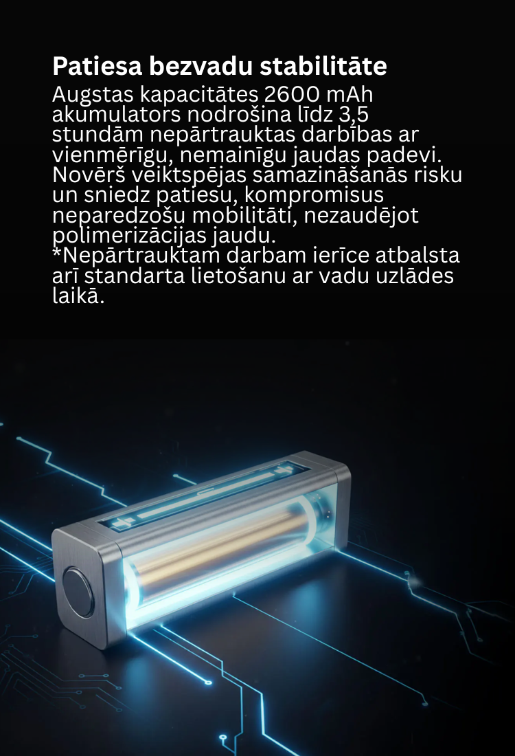 ✔ Belaidė patogybė – įmontuota 2600 mAh baterija leidžia iki 3,5 valandų nepertraukiamo darbo be laido