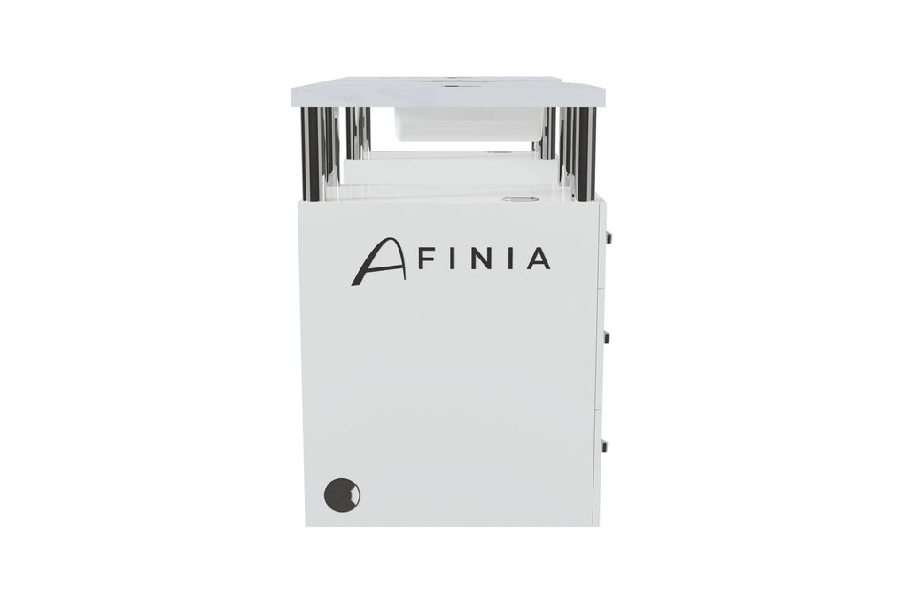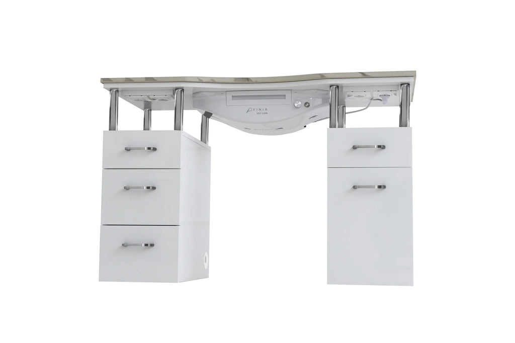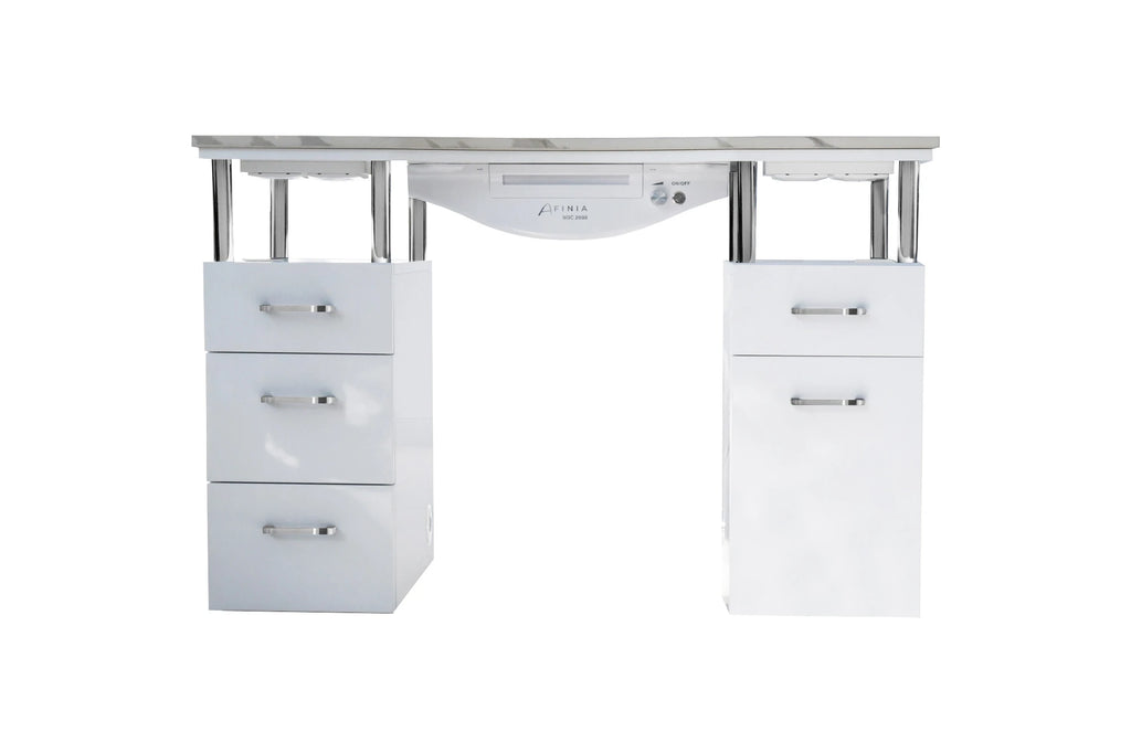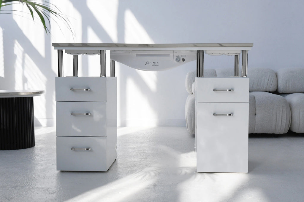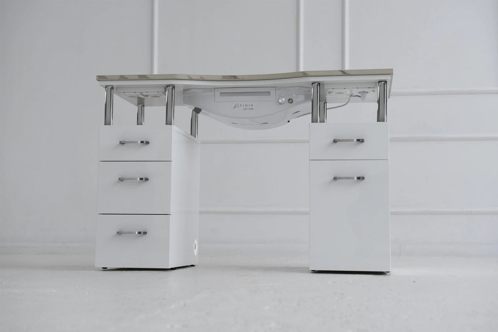 Afinia Basic kvarcinis manikiūro stalas yra funkcionalus ir estetiškas sprendimas patalpoms. Jo paprastas ir universalus dizainas turi daug vietos daiktams laikyti su 5 stalčiais. Stalo viršus, pagamintas iš suklijuoto kvarco, užtikrina neprilygstamą tvirtumą ir ilgaamžiškumą, žymiai pranokdamas granito savybes. Suklijuotas kvarcas yra labai atsparus mechaniniams pažeidimams, todėl jį labai sunku neatitaisomai sugadinti. Tai daro Afinia Basic manikiūro stalą ne tik gražiu, bet ir patikimu sprendimu bet kuriam grožio salonui.
