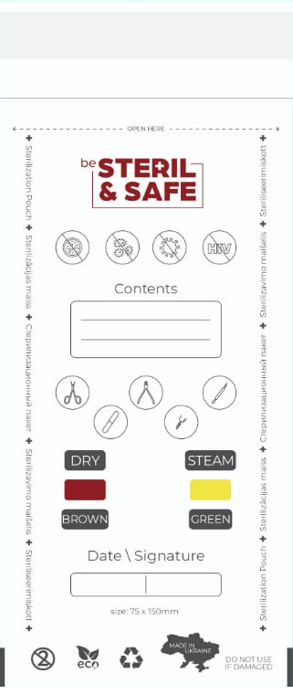 be STERIL&SAFE Karšto oro ir autoklavo derinamosios sterilizacijos maišeliai 75x150mm PKW su indikatoriumi Balti 100 vnt.