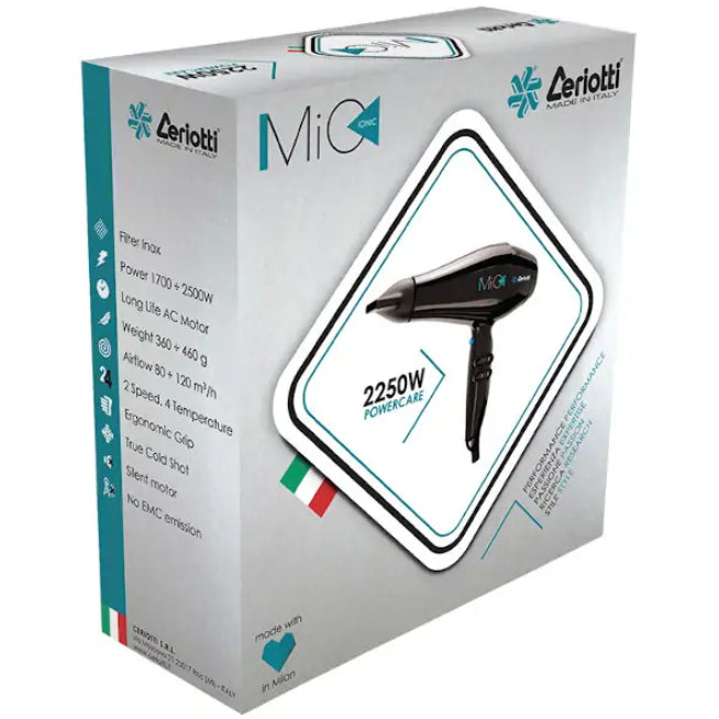 Ceriotti MIO IONIC modelis yra tikras italų profesionalus plaukų džiovintuvas su jonizacijos sistema. Šis džiovintuvas išsiskiria ne tik dideliu galingumu – 2250 W, bet ir keliomis kitomis privalumais. MIO IONIC modeliui būdinga nepaprastai galinga oro srovė – 105 kubinių metrų per valandą greičiu 49 metrai per sekundę. Tokiu našumu šis modelis per kelias minutes gali įveikti bet kokį uždavinį. Daugeliu atžvilgių tokios galimybės tapo realybe dėka patentuoto profesionalaus kintamosios srovės variklio AC EVO K16. Variklis sukasi 18 500 apsisukimų per minutę, o jo garantuotas minimalus tarnavimo laikas yra bent 2000 valandų.