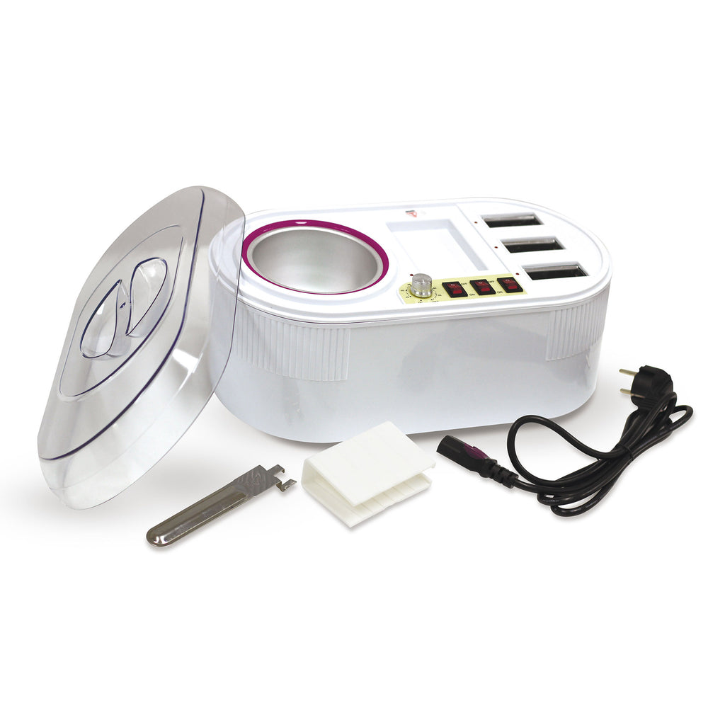 Baltos spalvos 1 kibiro šildytuvas su termostatu ir tinklo indikatoriumi bei 3 kasetės šildytuvai, kurių kiekvienas turi atskirą jungiklį, aprūpintas plastikinio kasetės laikikliu ir metaliniu kibiro laikikliu, kad apsaugotų rankas nuo nudegimų. Šildytuve yra plastikinis dangtelis, saugantis vašką nuo dulkių.