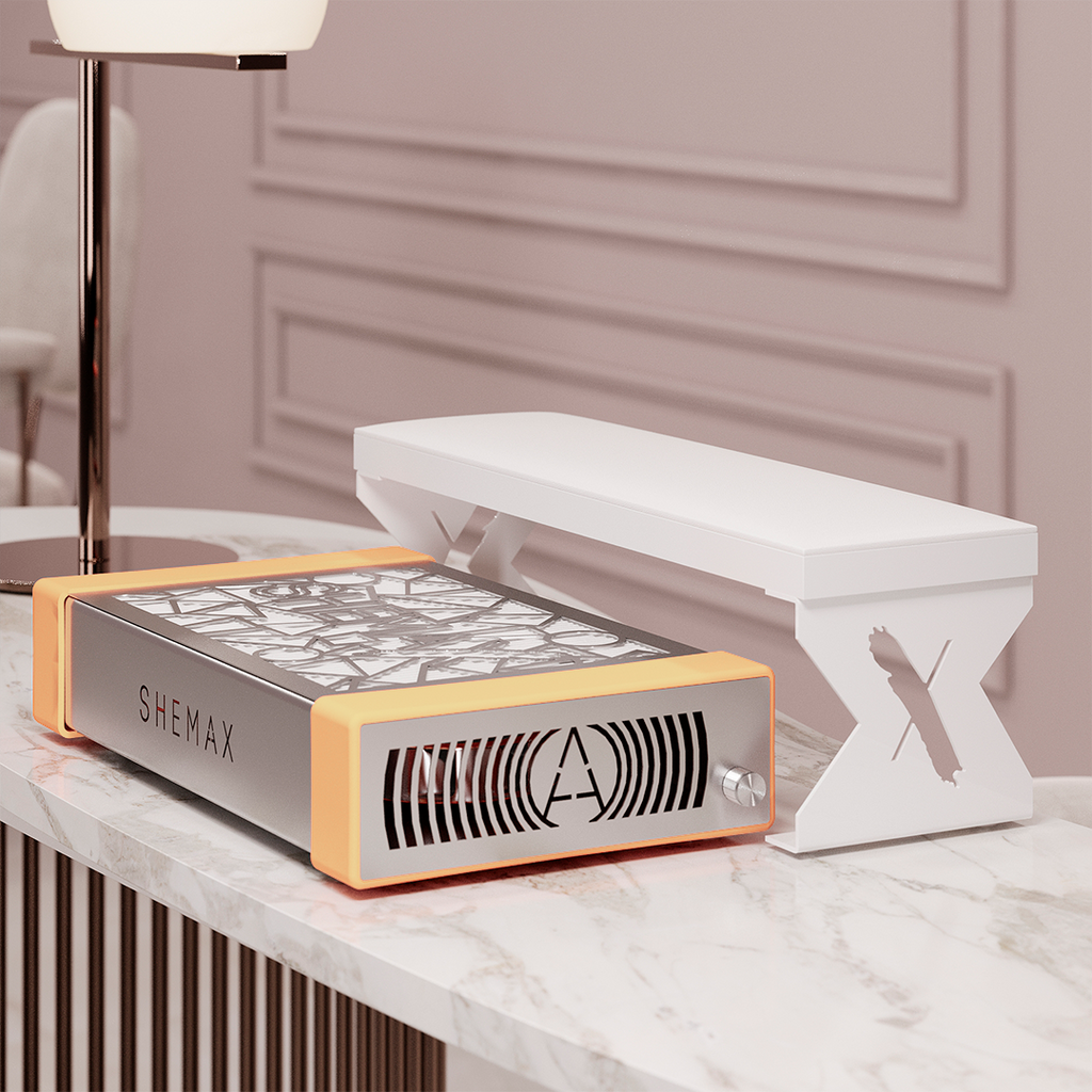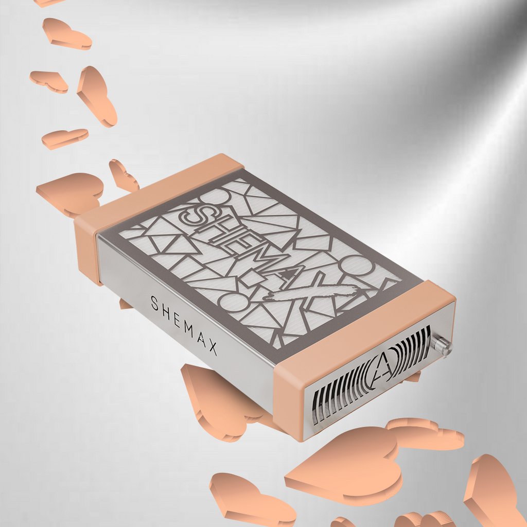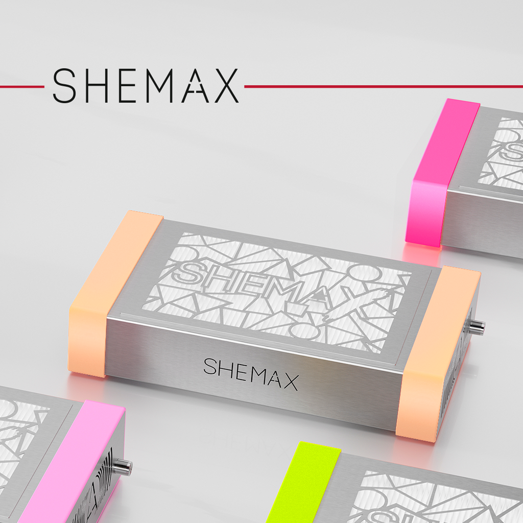 - SHEMAX logotipas įrėžtas ant kojų, suteikiant įrenginiui rafinuotumo ir pabrėžiant aukštą produkto kokybę.
