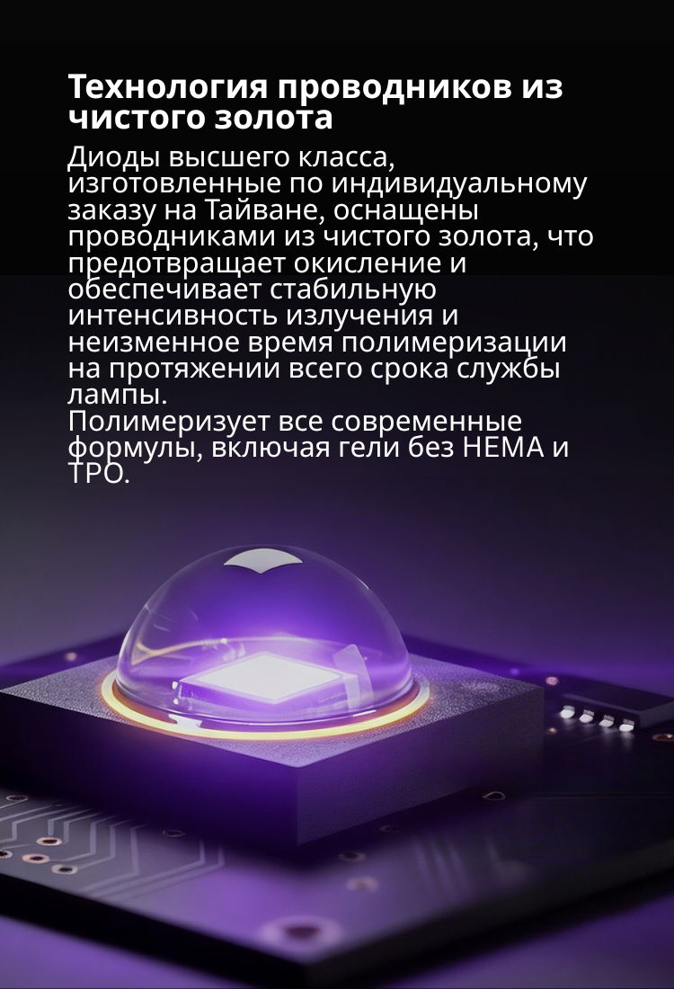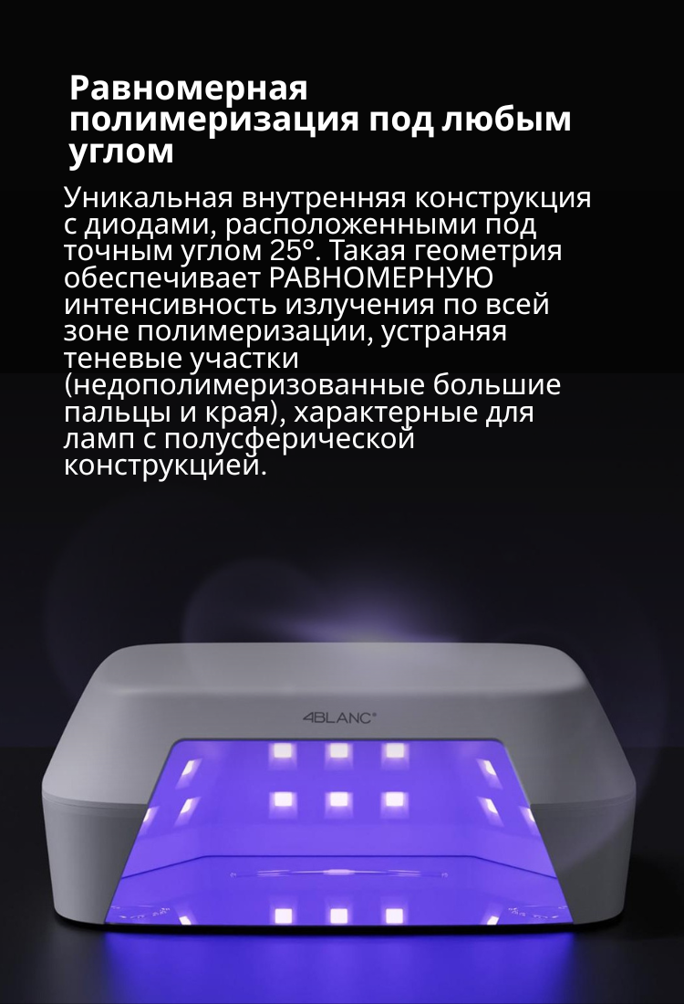 4BLANC Smart — это проводная UV/LED лампа для профессионального и домашнего использования, обеспечивающая быструю и равномерную полимеризацию всех гелевых материалов. Технология Pure Gold Wire гарантирует стабильный и равномерный свет на протяжении всего срока службы устройства.