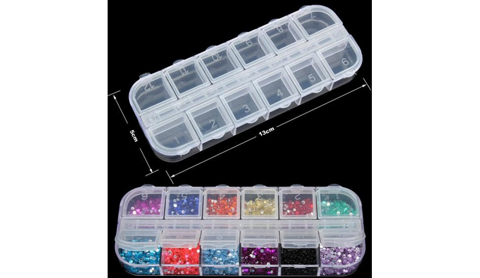 KODI PROFESSIONAL предлагает компактный, но вместительный контейнер для хранения мелких элементов декора – страз, декоративных камней, бульонок и прочих. 12 ячеек позволят разместить абсолютно все элементы декора небольшого размера, которые могут понадобиться в процессе работы. Чтобы ничего не потерялось и не перепуталось, каждая ячейка оснащена индивидуальной крышечкой, которая надежно закрывается и препятствует рассыпанию содержимого. Контейнер выполнен из плотного пластика.