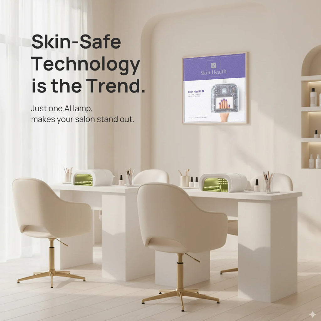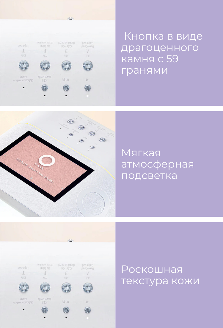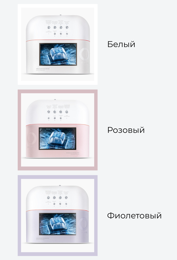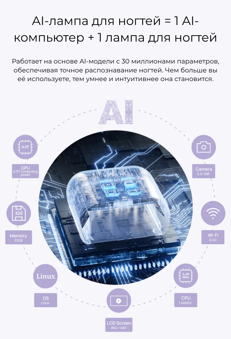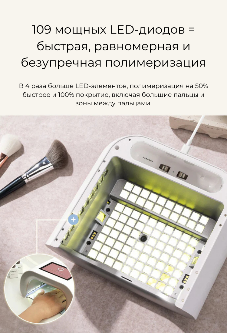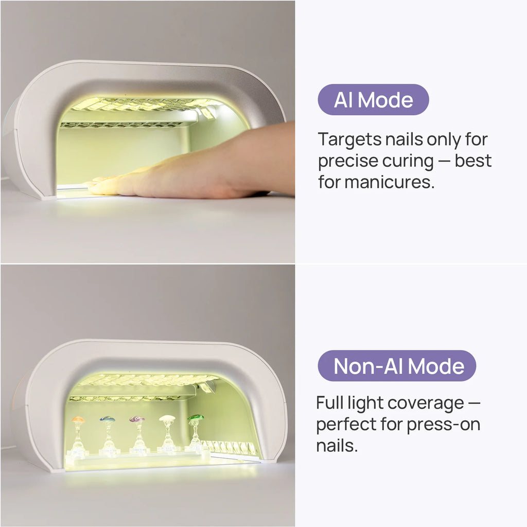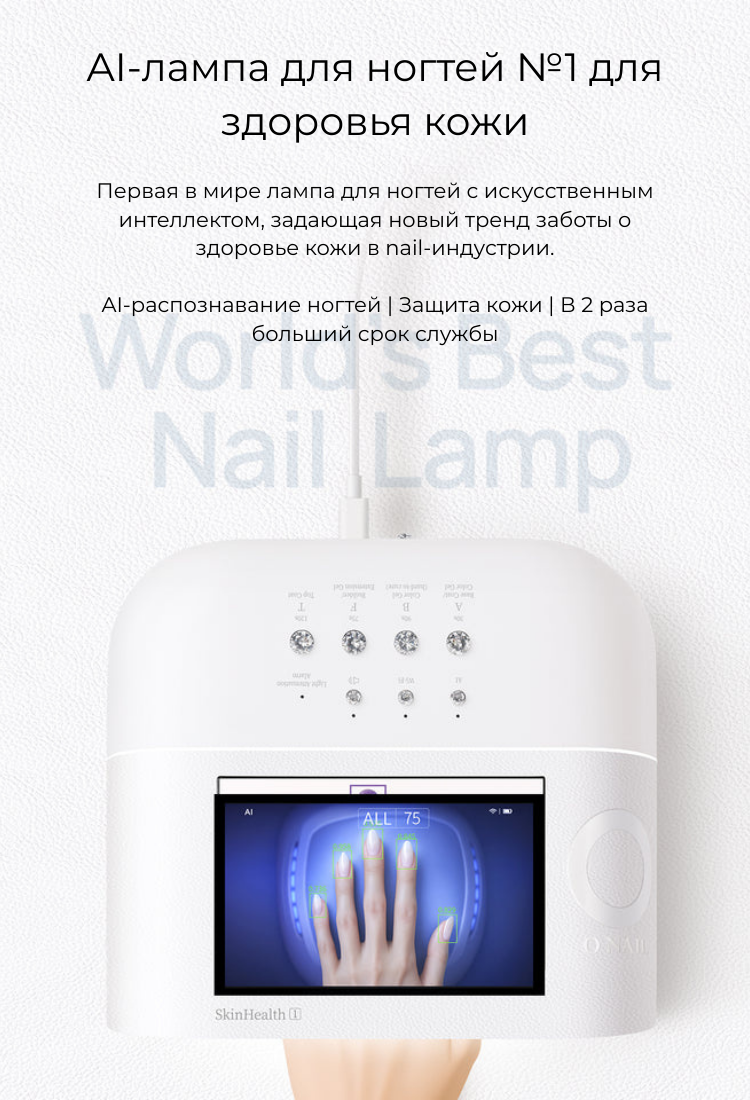 Сенсоры и AI технологии. Лампа оснащена сенсорами, AI-камерой и сеткой из 109 диодов. При помещении руки сенсоры считывают положение пальцев, и диоды включаются точечно, направляя свет только на ногтевую пластину. При движении руки или постановке одного пальца диоды автоматически адаптируются. Это защищает кожу и глаза от вредного УФ-излучения. На дисплее отображается направление света в реальном времени. Диоды служат в два раза дольше — до 2 лет без потери мощности, так как в AI-режиме работают попеременно. При неправильном положении руки лампа дает подсказки на экране или голосом, которые можно отключить. Сушка проходит равномерно и на 50% быстрее. Срок службы устройства — 2–5 лет в салонах и до 10 лет при домашнем использовании.