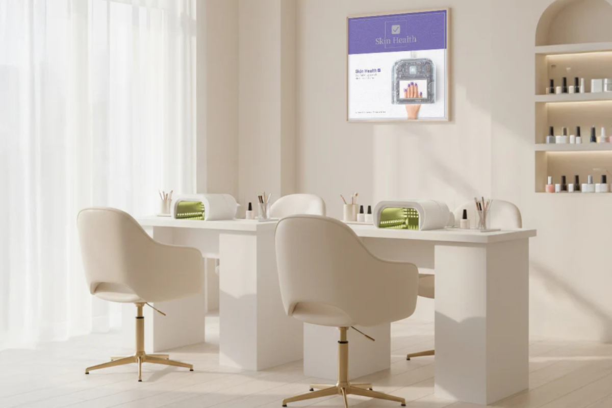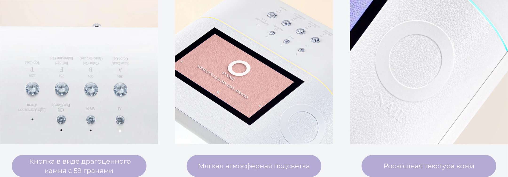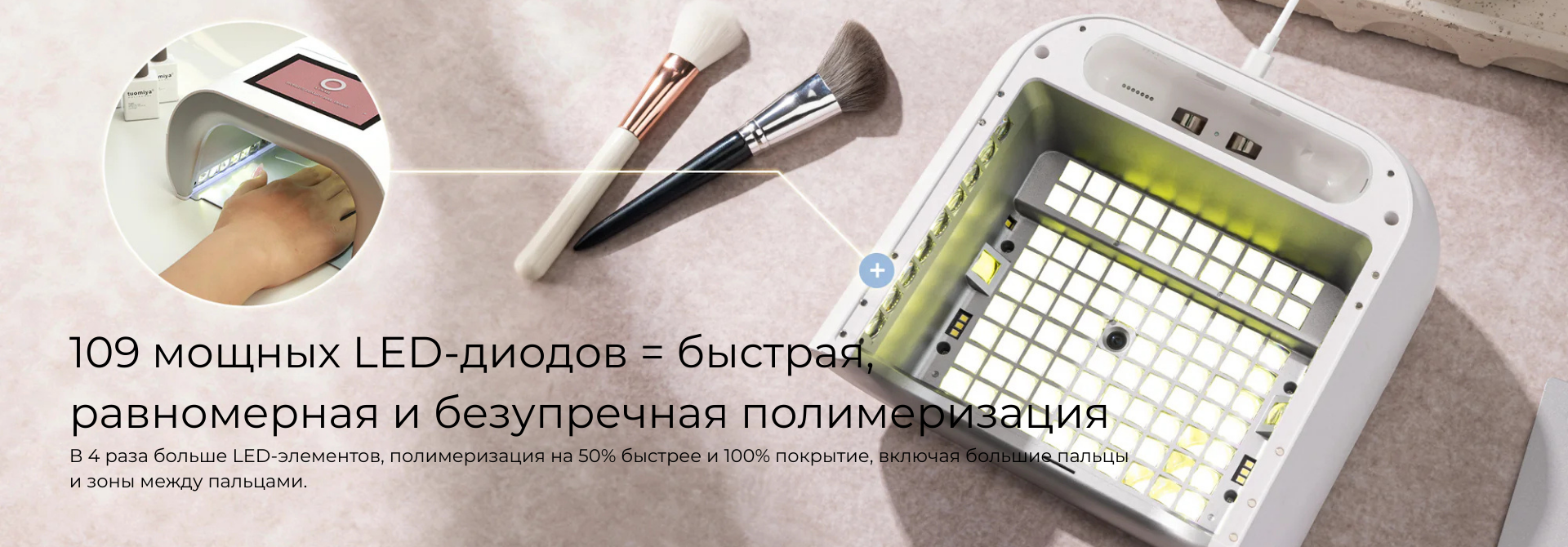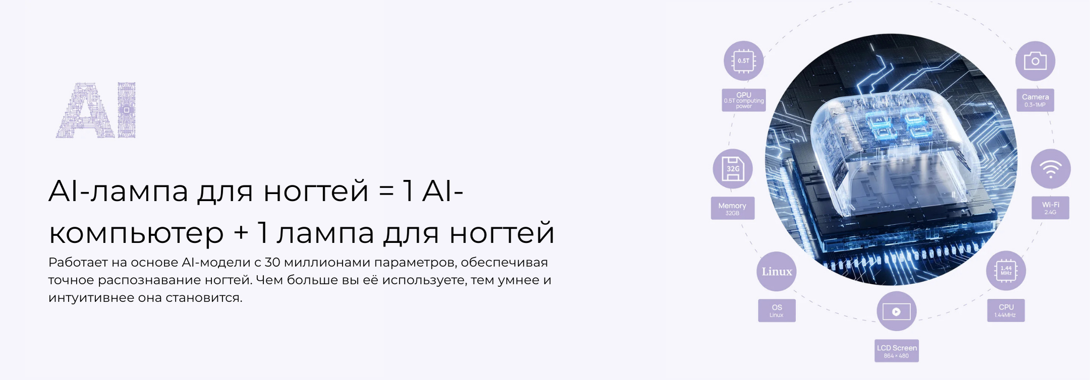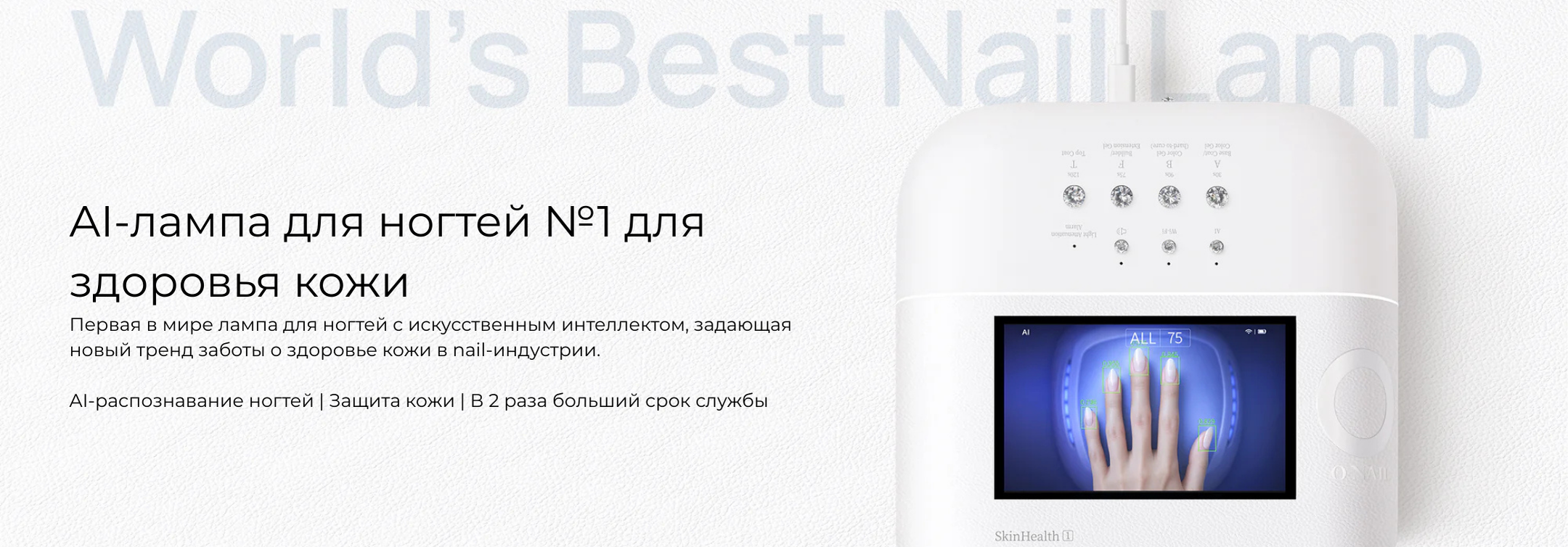 Сенсоры и AI технологии. Лампа оснащена сенсорами, AI-камерой и сеткой из 109 диодов. При помещении руки сенсоры считывают положение пальцев, и диоды включаются точечно, направляя свет только на ногтевую пластину. При движении руки или постановке одного пальца диоды автоматически адаптируются. Это защищает кожу и глаза от вредного УФ-излучения. На дисплее отображается направление света в реальном времени. Диоды служат в два раза дольше — до 2 лет без потери мощности, так как в AI-режиме работают попеременно. При неправильном положении руки лампа дает подсказки на экране или голосом, которые можно отключить. Сушка проходит равномерно и на 50% быстрее. Срок службы устройства — 2–5 лет в салонах и до 10 лет при домашнем использовании.